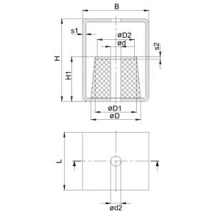 Durchmesser D (mm)Durchmesser d (mm)Durchmesser D2 (mm)Breite B (mm)Höhe H (mm)Länge L (mm)Metallstärke S1 (mm)Metallstärke S2 (mm)Bohrungsdurchmesser d (mm)Höhe H1 (mm)