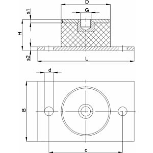 Durchmesser D (mm)Breite B (mm)Höhe H (mm)Länge L (mm)Metallstärke S1 (mm)Metallstärke S2 (mm)Gewinde G (metrisch)Bohrungsdurchmesser d (mm)Bohrungsabstand c (mm)